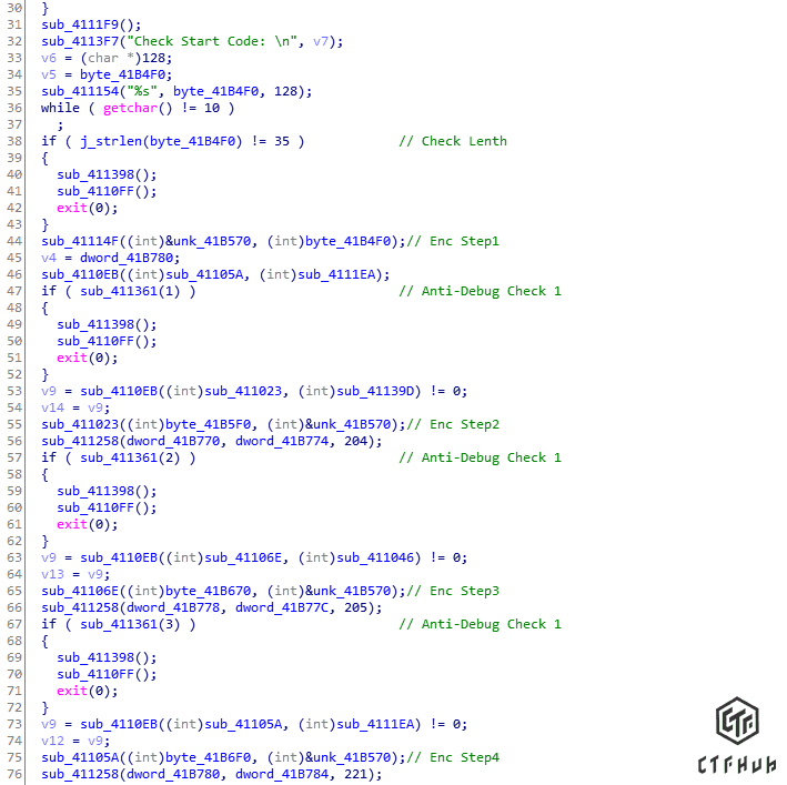 用TLS检测工具进程和调试器,进入主函数后先检测用户名,通过后检测StartCode(即flag),最后输入'Y'确认CM。