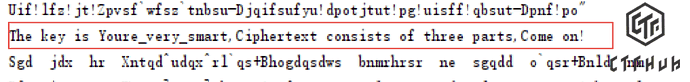 得到key为Youre_very_smart,密文分为三部分,通过文件比对软件很容易找到三处位置