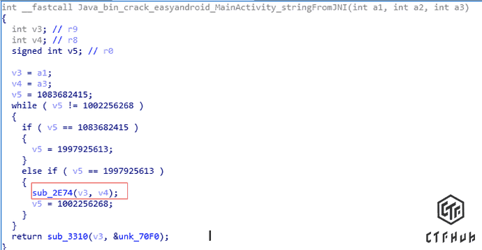 当apk运行起来后,字符串会自动解密,接下来重点关注sub_2E74函数。