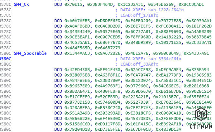该函数流程已经被高度混淆,可以有选择的对其调用的子函数进行断点跟踪(需要注意apk的断点扫描检测,发现断点会直接崩溃),根据动态调试的数据分析并识别出重点函数sub_1228(变异SM4算法ECB模式),sub_DA4(变异base91算法)。分析出SM4魔改的数据如下: