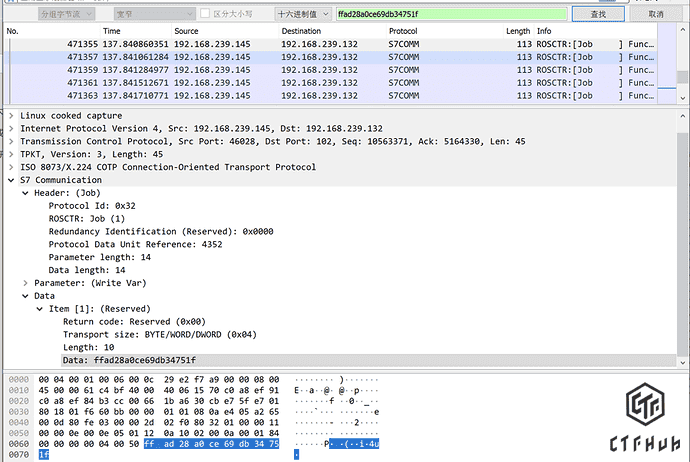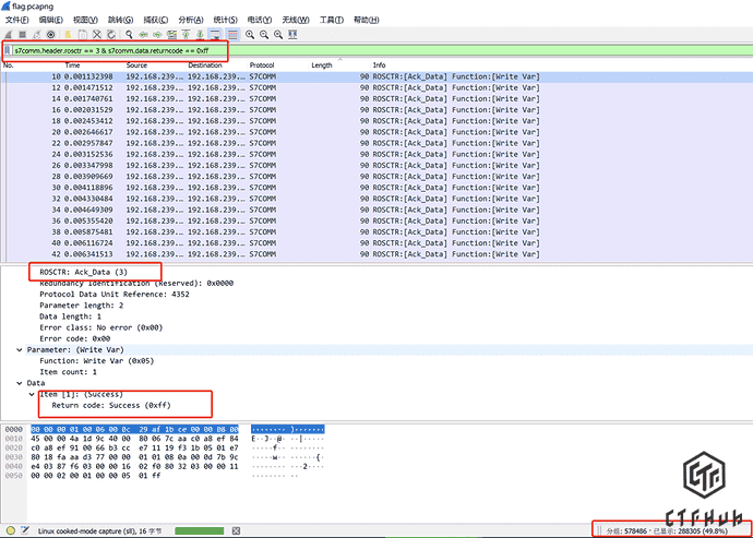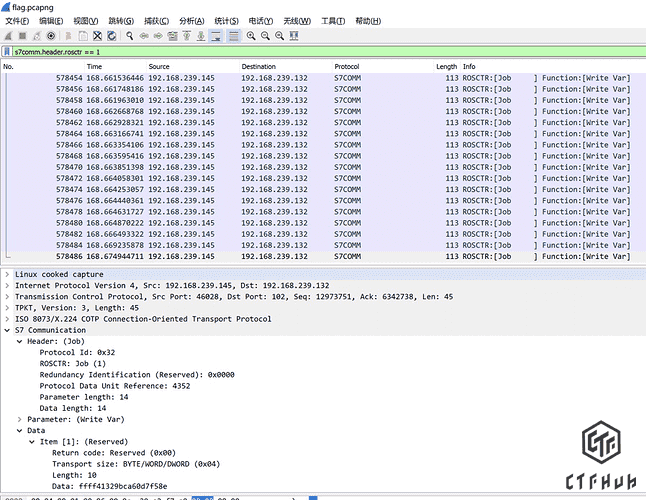 这是一个S7comm协议的数据包。但是流量中存在一条异常写入的数据。找出异常流量的ascii数据流。flag格式为flag{ascii数据流}
