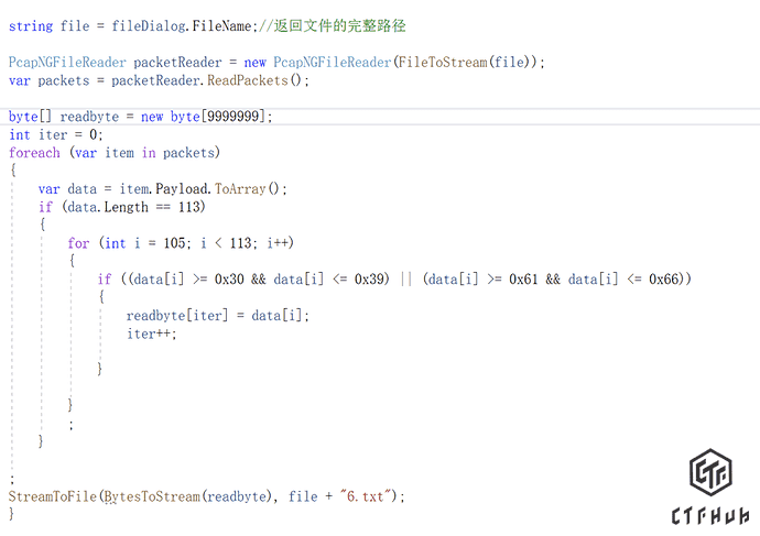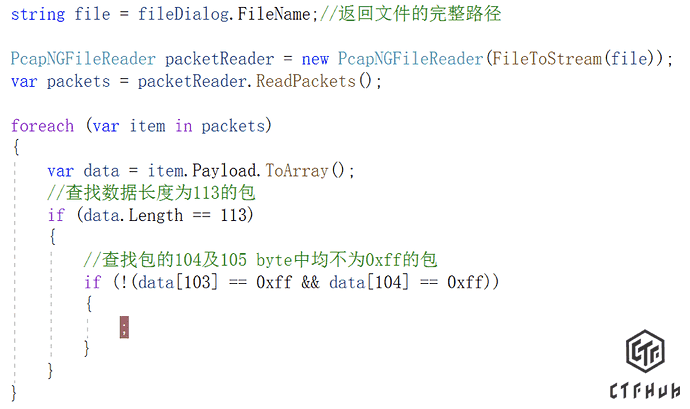 编写了下面的筛选代码:对所有长度113的包进行过滤,最开始走了不少弯路,以为是把后面变化的字节过滤出来,进行合并,然后还原flag的。