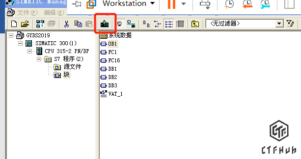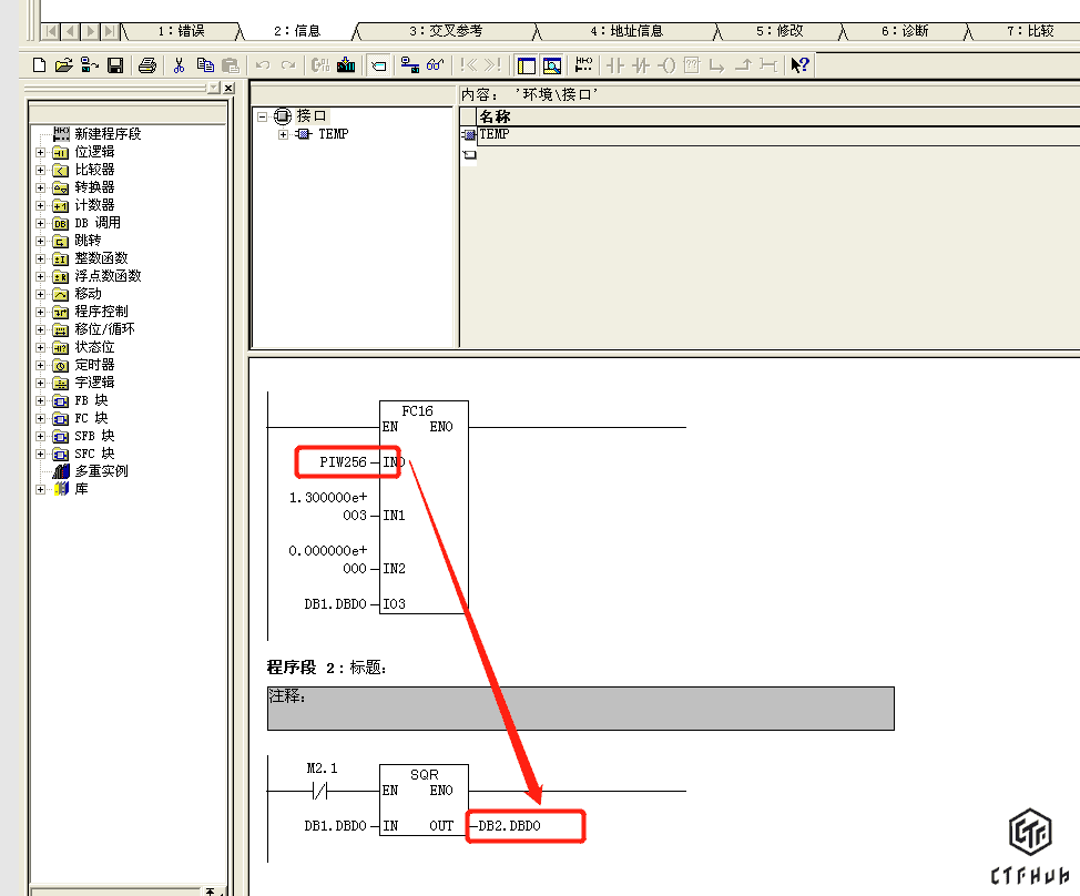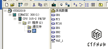 打开后, 可以看到有几个功能块, 其中 0B 是主程序, FC 是功能块(子程序), DB 是数据块, OB 和 FC 里面找,程序很简单,根据题目说明, 在 OB1 中找到了 PIW 和 DB2.DBD0