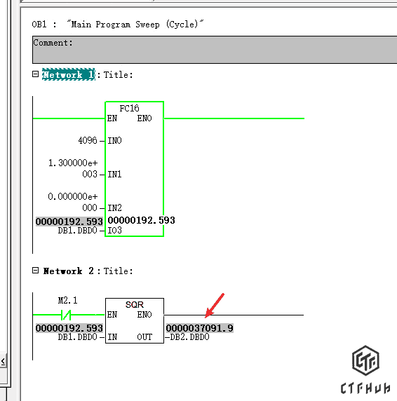 因为最开始我们已经把 PIW256 值改为了 4096, 所以程序会自动计算结果,在 DB2.DBD0 上显示的值即为 flag。