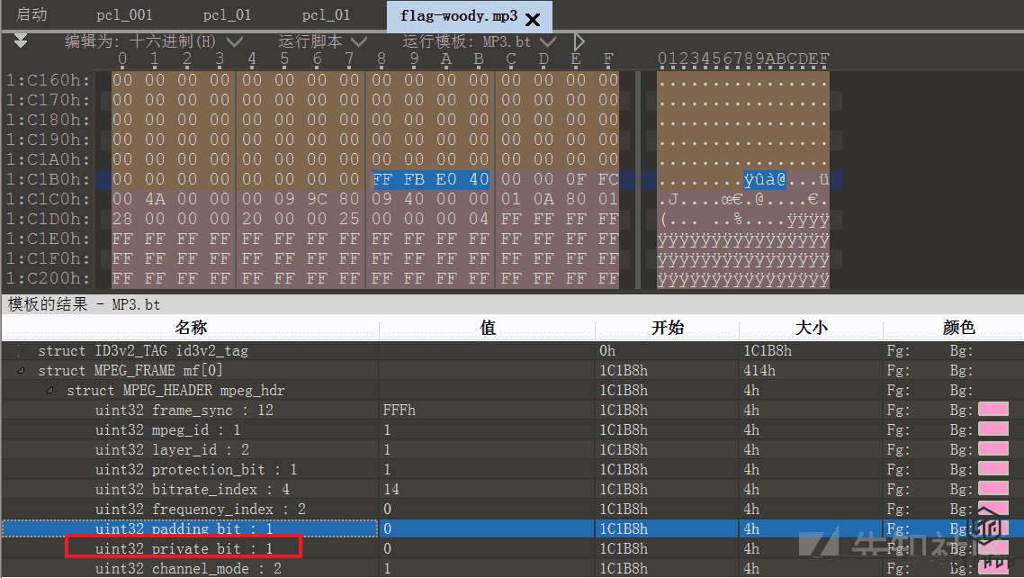 题目提示文件使用了private加密信息,在010Editor中打开mp3文件,发现存在private bit,因此,只需要提取每一个mf组中的该字节,组合起来,就是答案。可以从图中看到 ms 开始位为1 C1B8H,即第115128字节,如图所示:,如图所示: