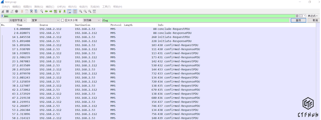 打开pacp文件,看到有mms协议,先过滤一下mms协议,同时搜索flag字符串