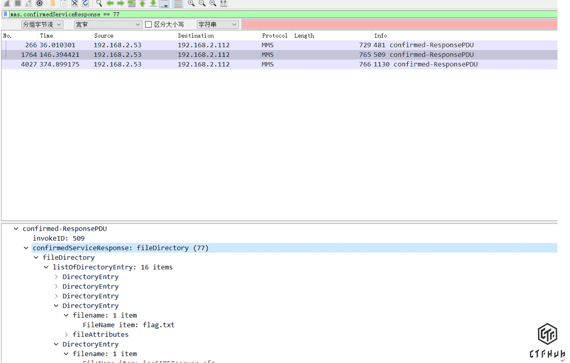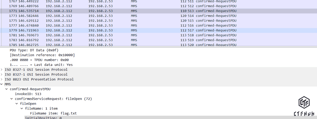第1771、1798、1813、4034条都对flag.txt进行了打开操作。接下来去每条报文后边一条看是否有fileread进行了读取。最终在1800处发现,其读取了flag.txt,1801是回复报文