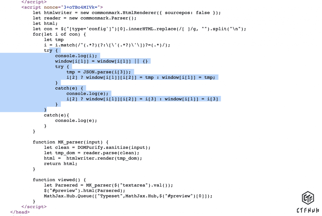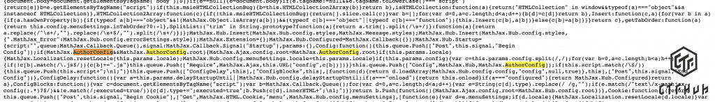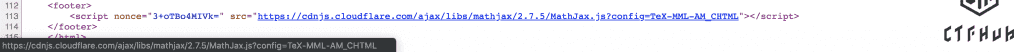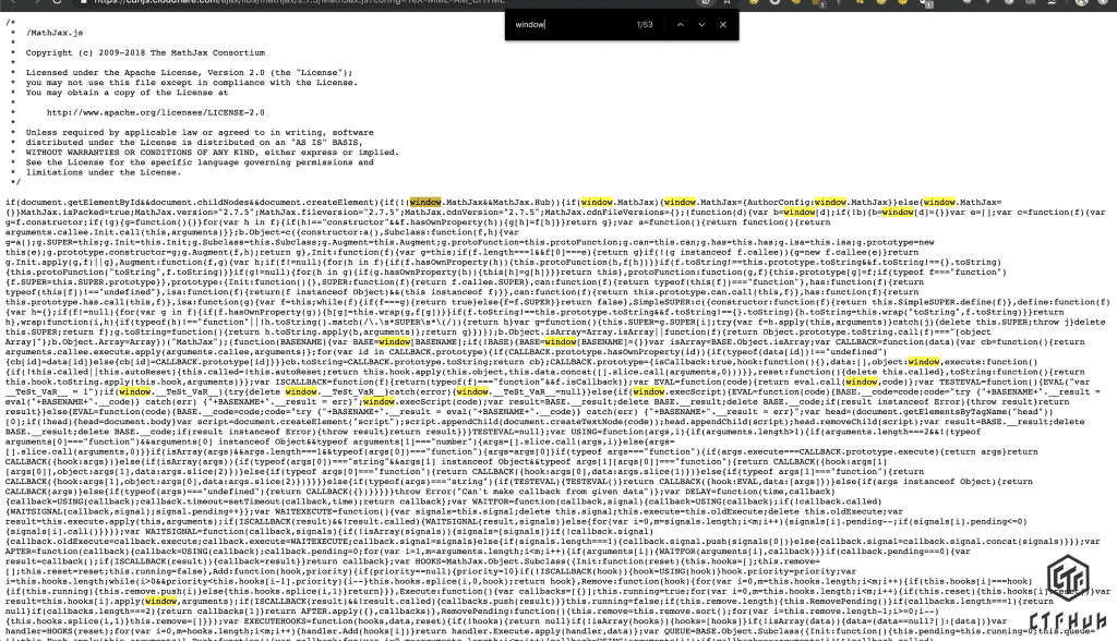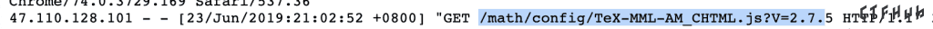 可以看到,其对 config 进行解析,首先处理换行,而后对其进行解析 -config['name']=value会被赋值到 window 的config里的 name value。 -name=value的会被赋值到 window 的 name,值为 value。 那么看看有什么地方读了 window 的,可以看到这里加载了 mathjax 来处理数学公式的显示。