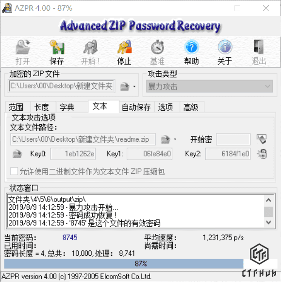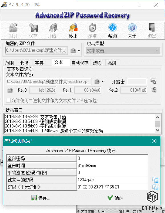 使用工具Advanced ZIP Password Recovery进行明文爆破攻击。爆破成功,解压密码为123#qwe!