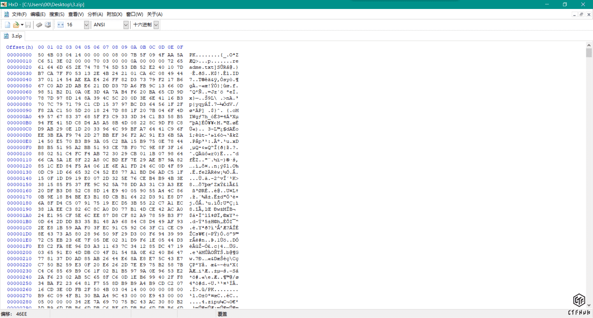 把十六进制文件复制到HxD保存,得到压缩包命名为3.zip