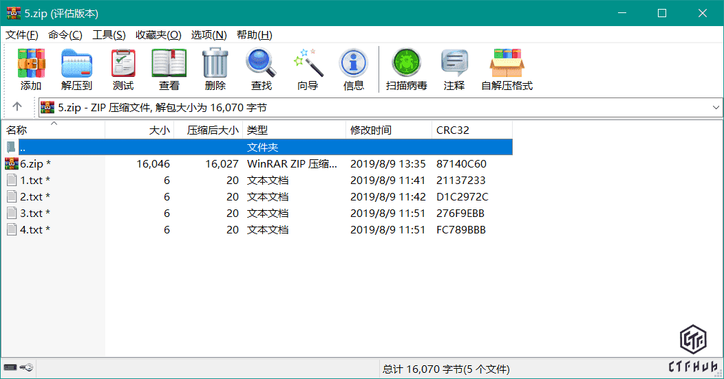 打开5.zip,发现有好几个txt,内容都比较小,解压需要密码,猜测是CRC32爆破 使用脚本进行CRC32爆破,得到密码welc0meTo7his_un_ctf