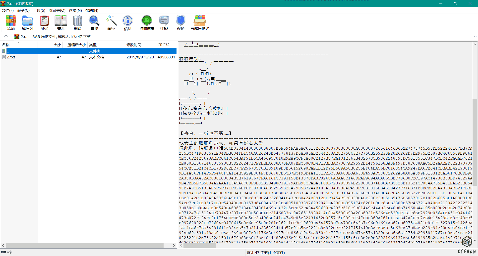 发现是一个名称为1的文件,根据题目提示添加后缀rar,改为1.rar,解压得到2.rar 解压出来的txt无用,下一个压缩包藏在注释里