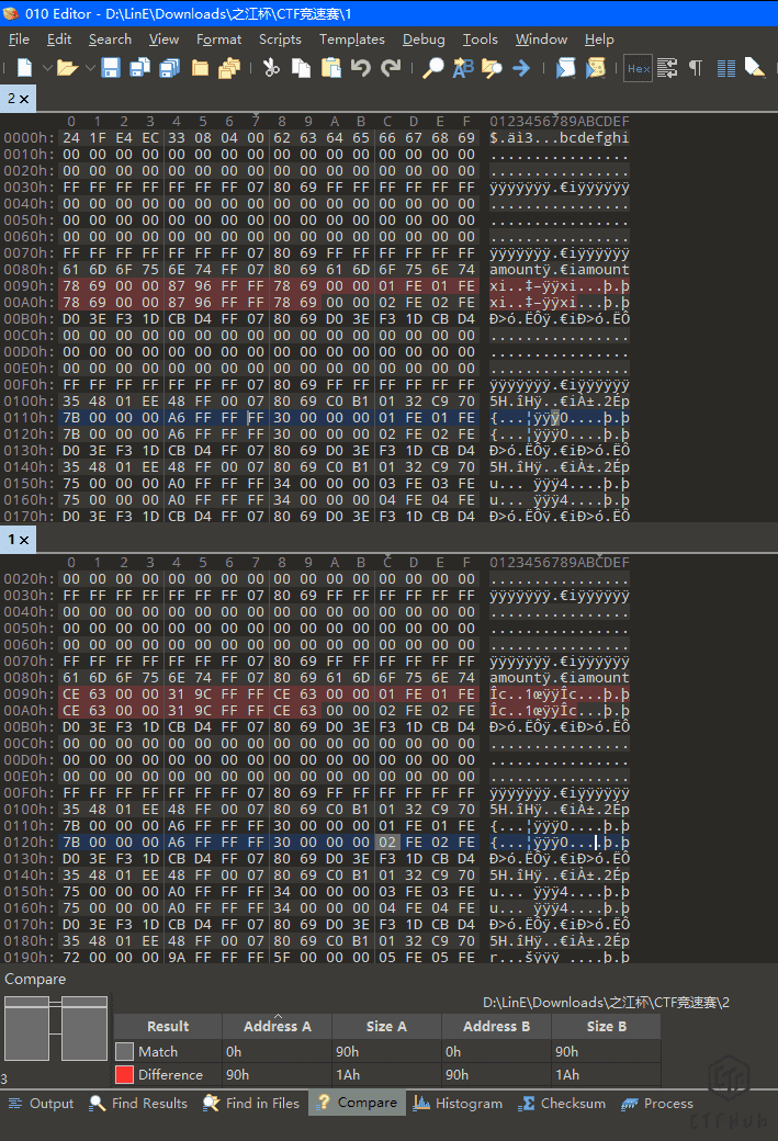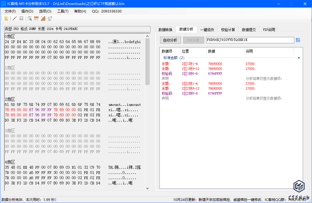某工厂员工的IC卡被黑客做了手脚请进行分析,请对比两个数据中金额的不同,找出数据加密的规律,破解黑客留下的信息,flag格式为flag{}。