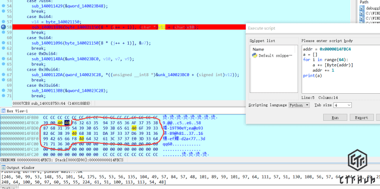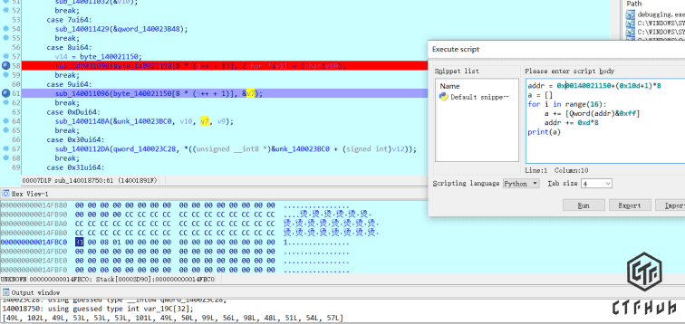来到vm部分,注意每次的操作码都有&ff,所以opcode有大量垃圾数据。可以直接在idapthon中打印出所有opcode看看程序操作顺序。