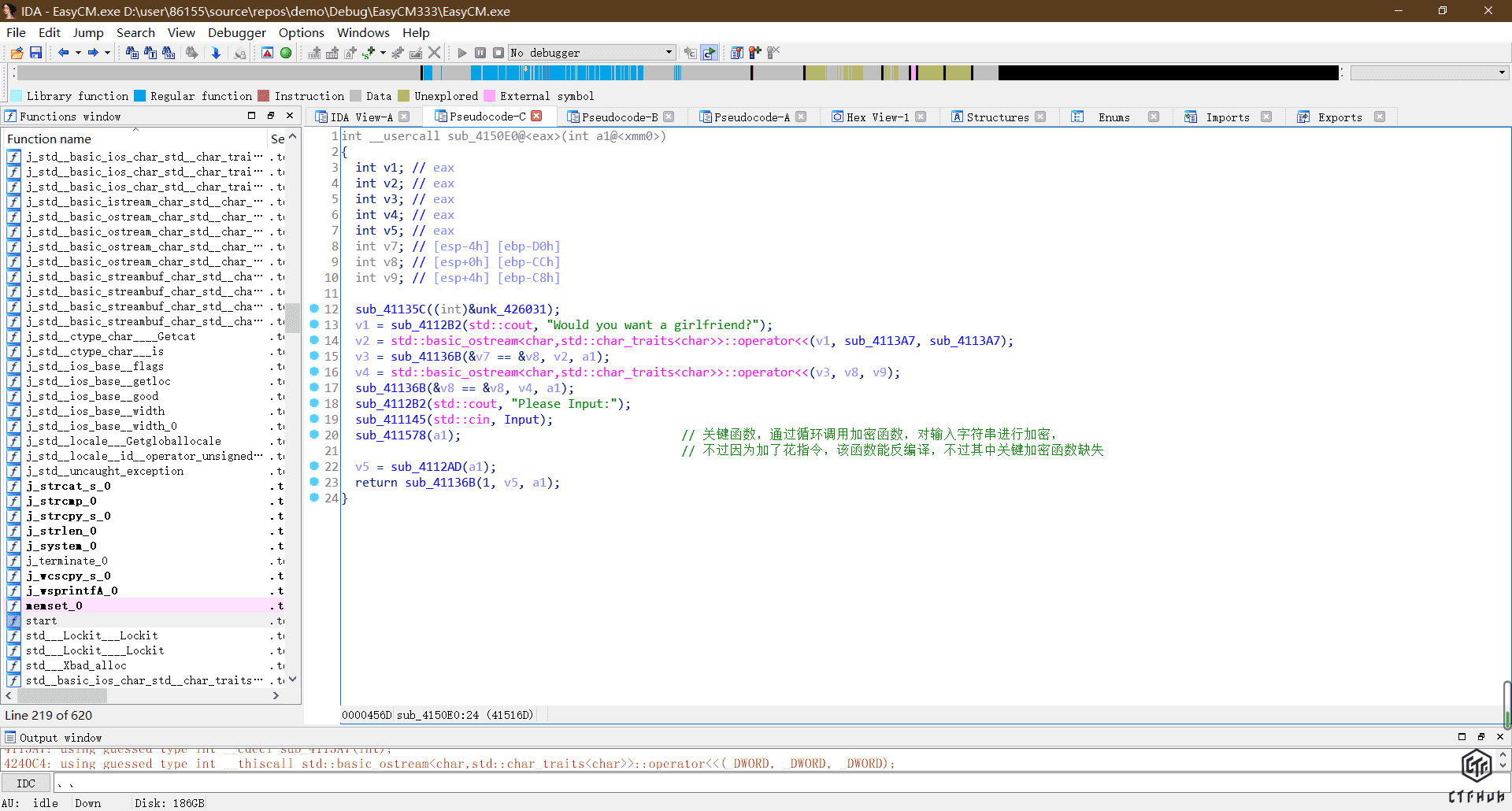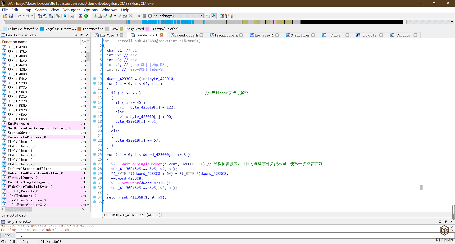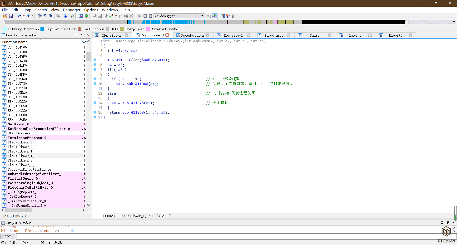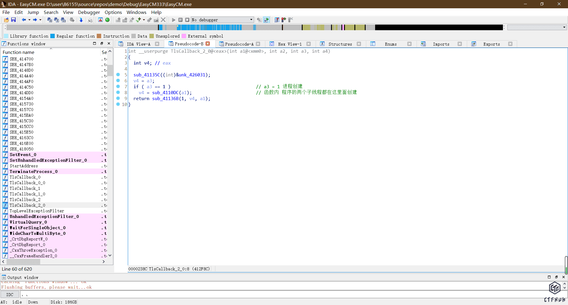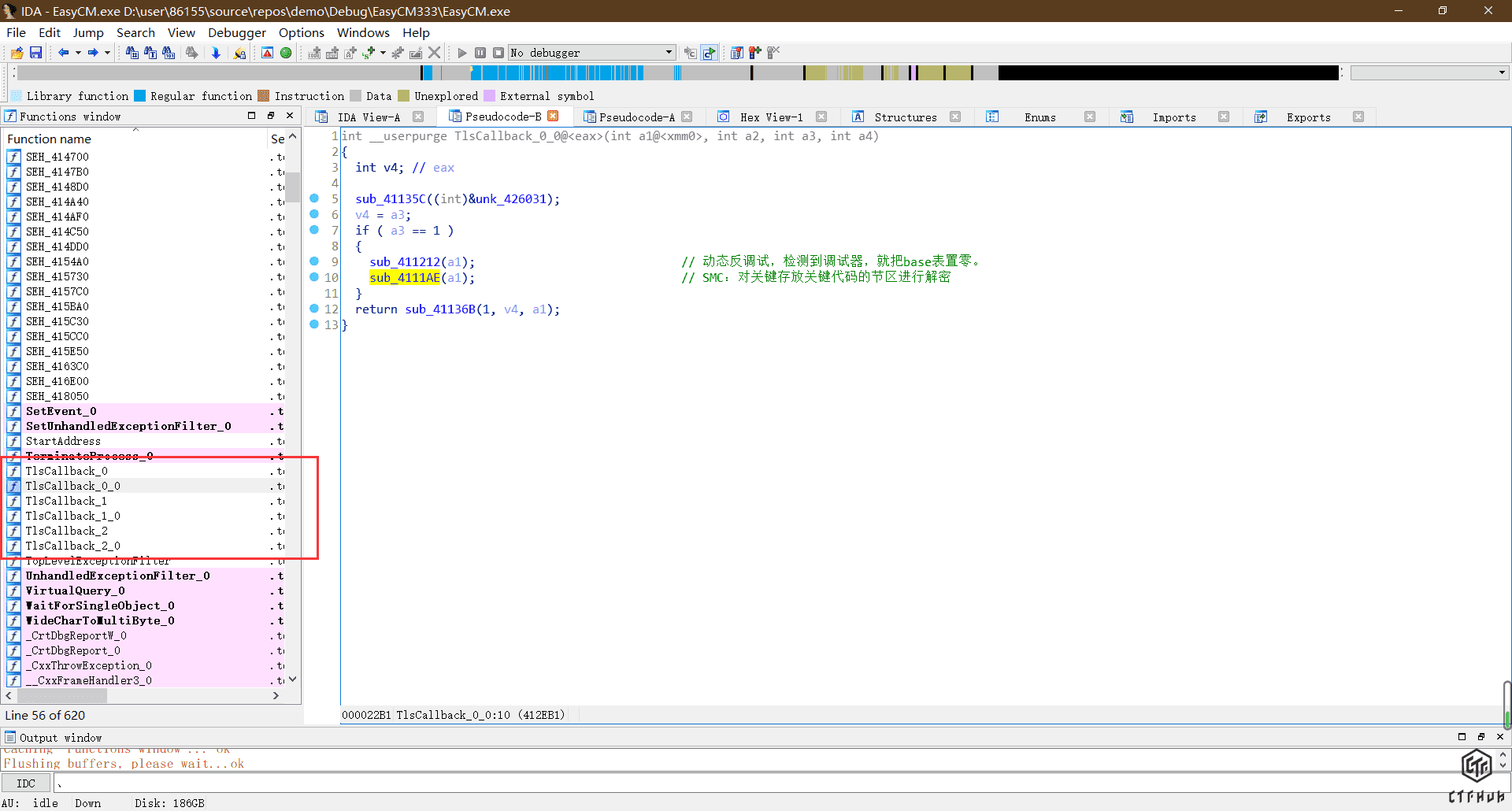通过TLS回调函数对程序关键加密函数进行SMC自解码,用户输入字符串,通过关键加密函数加密后与字符串比对。