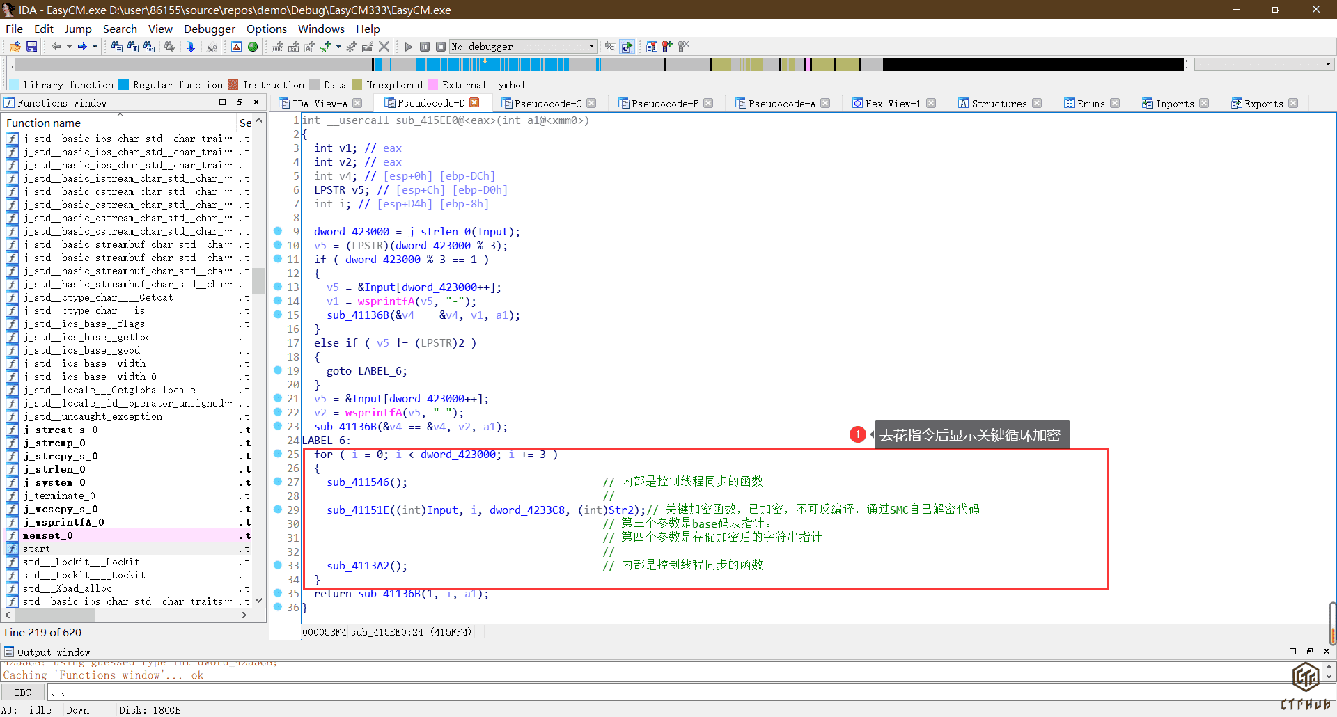关键函数内部,因为添加花指令,循环调用关键加密函数 的部分缺失。