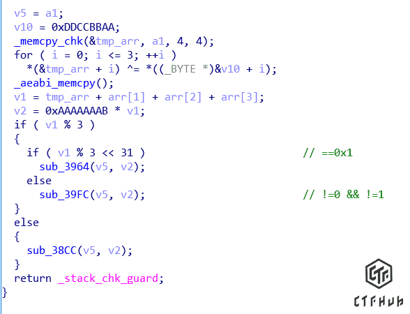 可见传入的flag的前四个字符会先复制到tmp_arr中,然后与v10指向的数组的每个元素进行异或。这里v10的元素可知为AA,BB,CC,DD。将异或后的所有数相加余3,当为0则进入sub_38CC,为1则进入sub_3964,为2则进入sub_39FC。