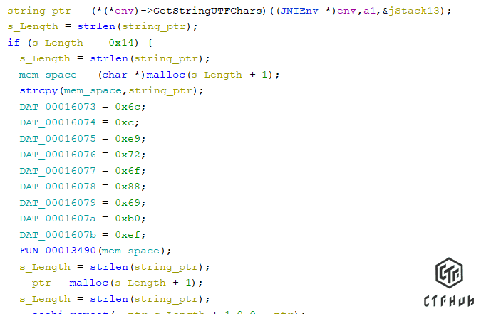 FUN_00013490函数传递了含flag的内存地址,跟进后发现无法解析。推测可能会运行时解密