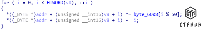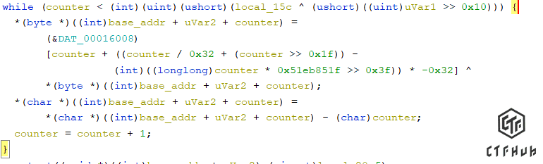 可以看到这个循环里会对base_addr加一个偏移的位置与某个数组的某个元素进行异或操作。再将异或后的结果减去当前计数器计数。我太菜了看不懂ghidra这段的伪代码,换个工具