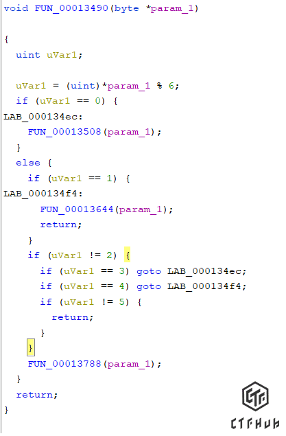 首先去第一个字符,如果余6的结果是0和3则到FUN_00012508,1和4到FUN_00013644,2和5到FUN_00013788
