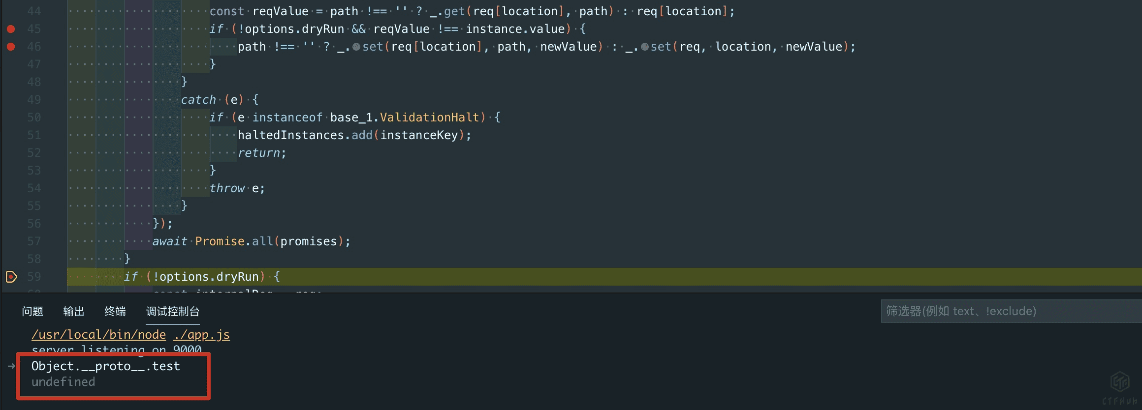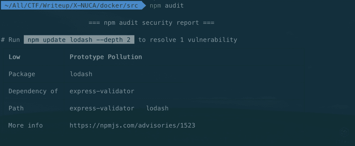在题目环境中npm install的时候就会有提示,express-validator库中的所依赖的lodash库存在原型链污染漏洞。