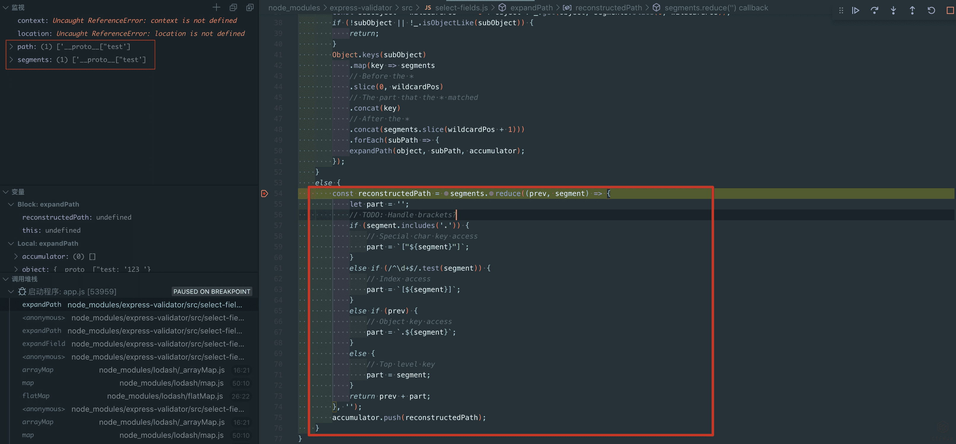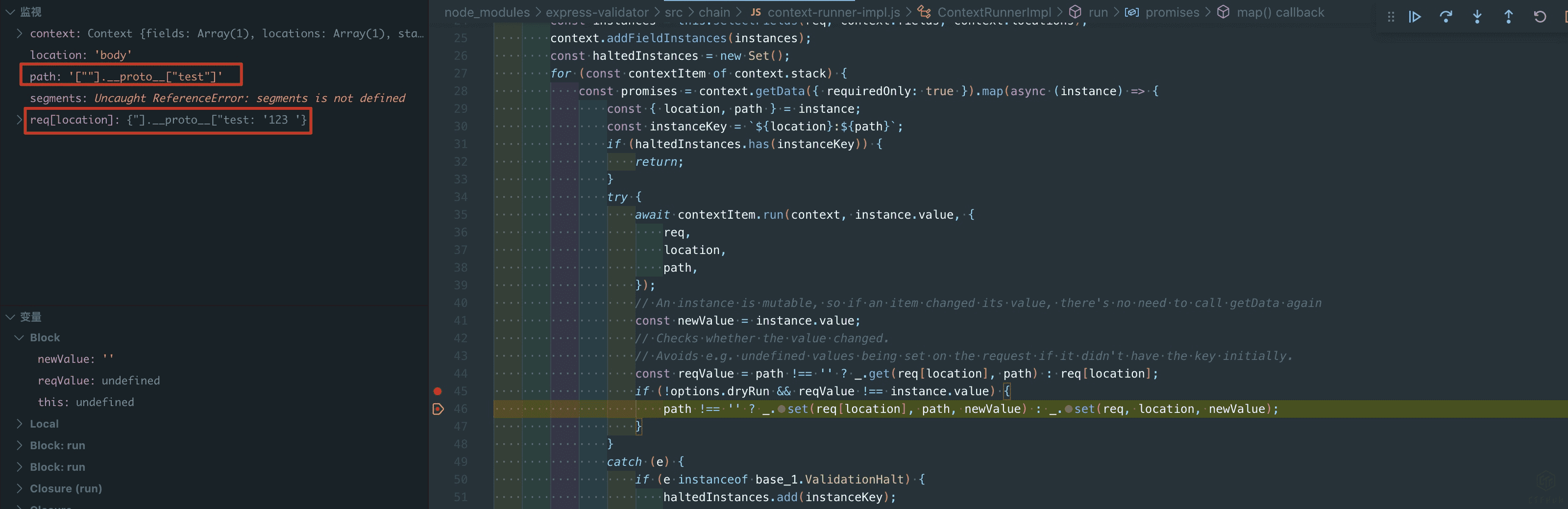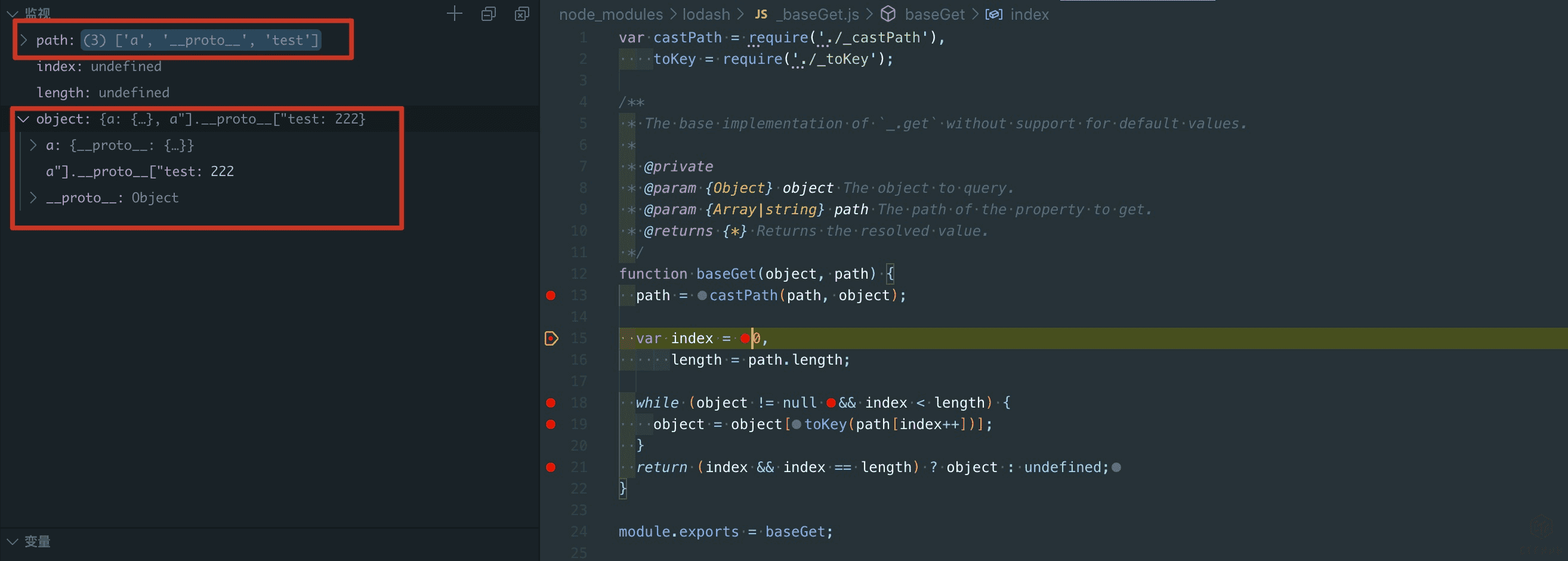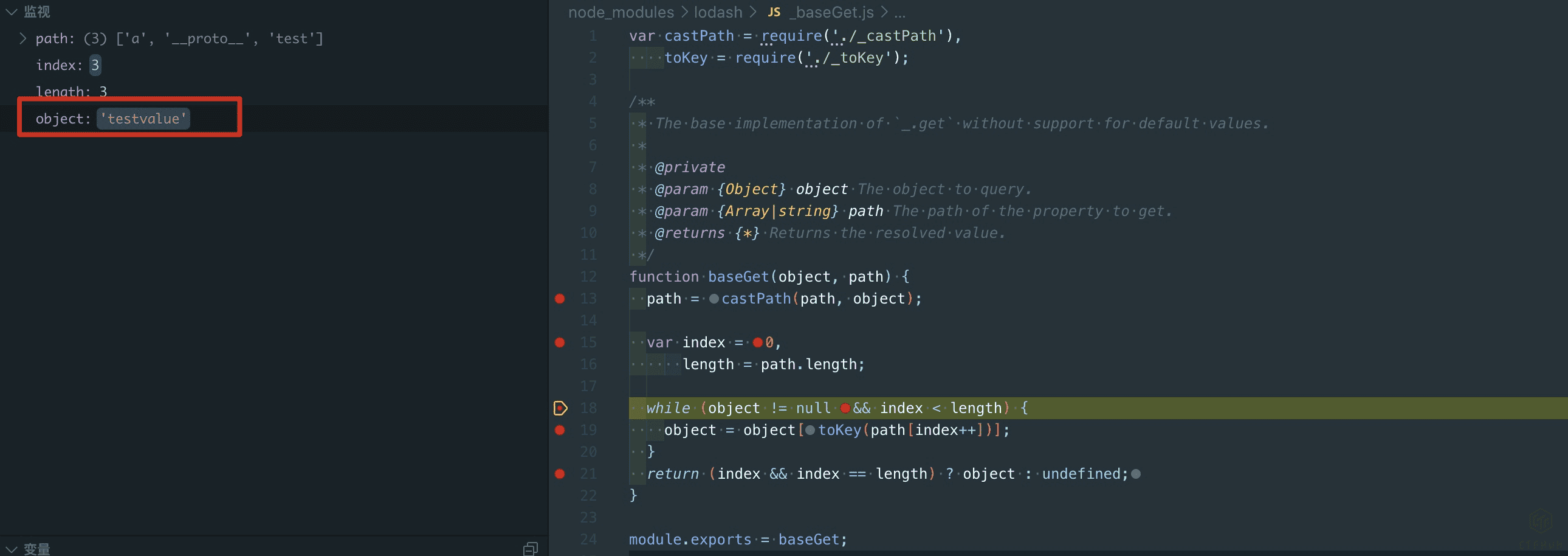 这个时候我们在这个函数处下断点就可以看到,a\"].__proto__[\"test经过castPath处理变成了["a", "proto", "test"],在Object循环取值最终取到的是"a": {"__proto__": {"test": 'testvalue'}中的test键的值,这样就达到了控制value的目的。