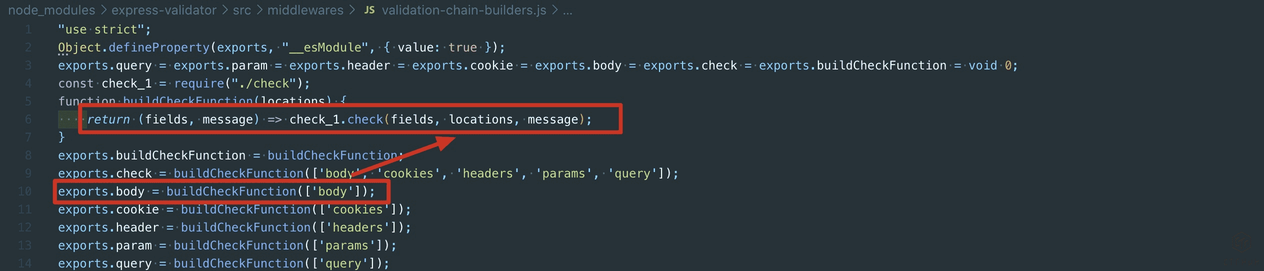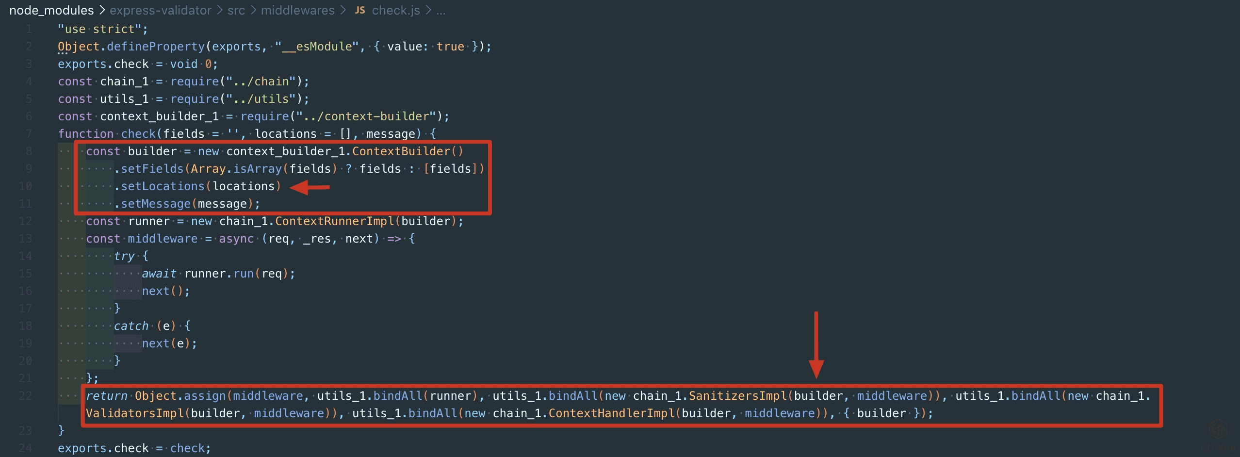 先看return的地方,check函数里的middleware就是express-validator最终对接express的中间件。utils_1.bindAll函数做的事情就是把对象原型链上的函数绑定成了对象的一个属性,因为Object.assign只做浅拷贝,utils.bindAll之后Object.assign就可以把sanitizers和validators上面的方法都拷贝到middleware上面了,这样就能通过这个middleware调用所有的验证和过滤函数。