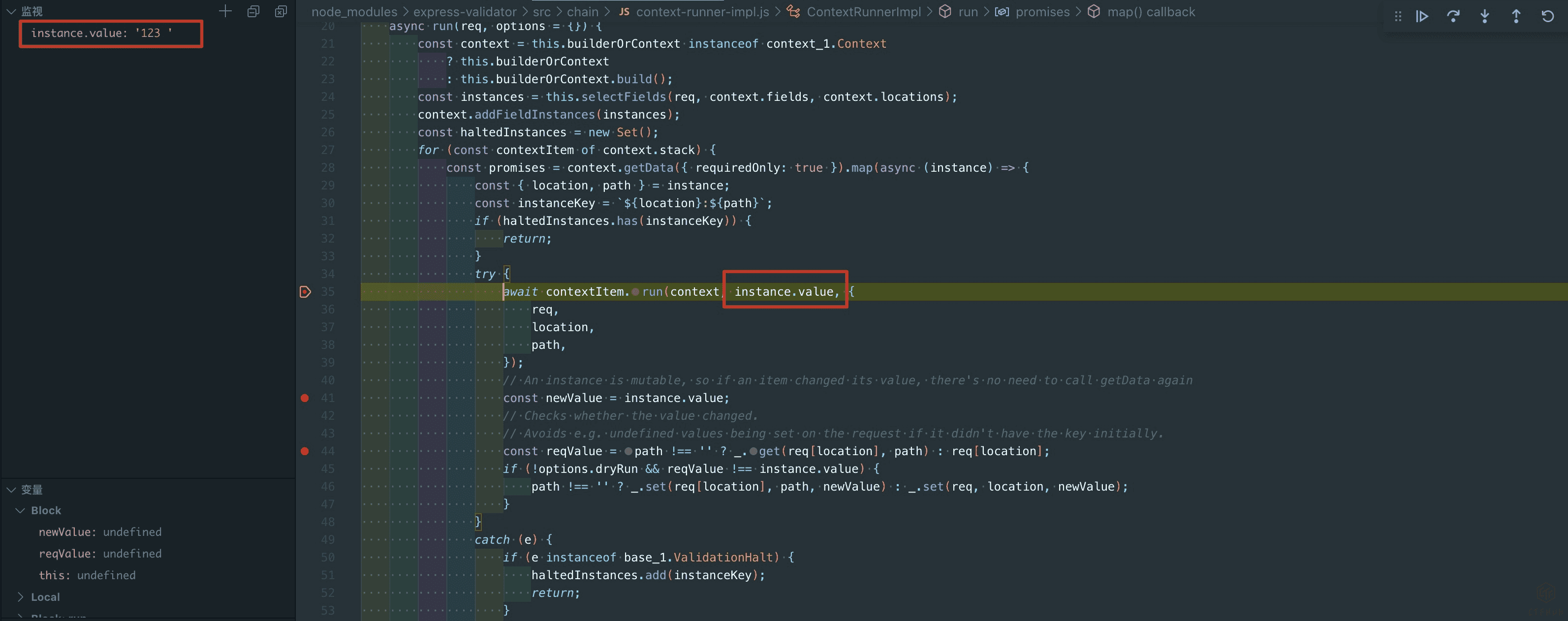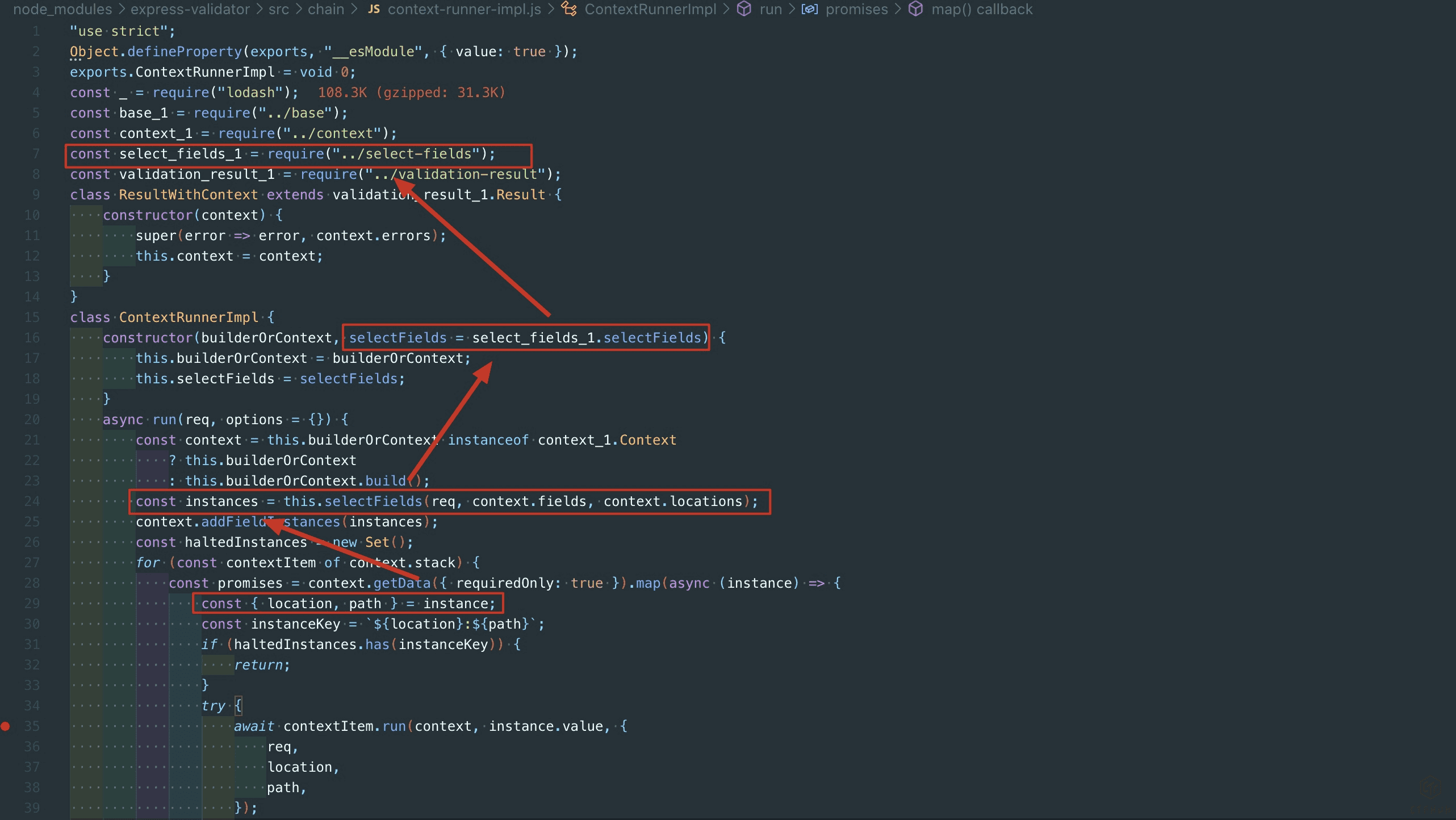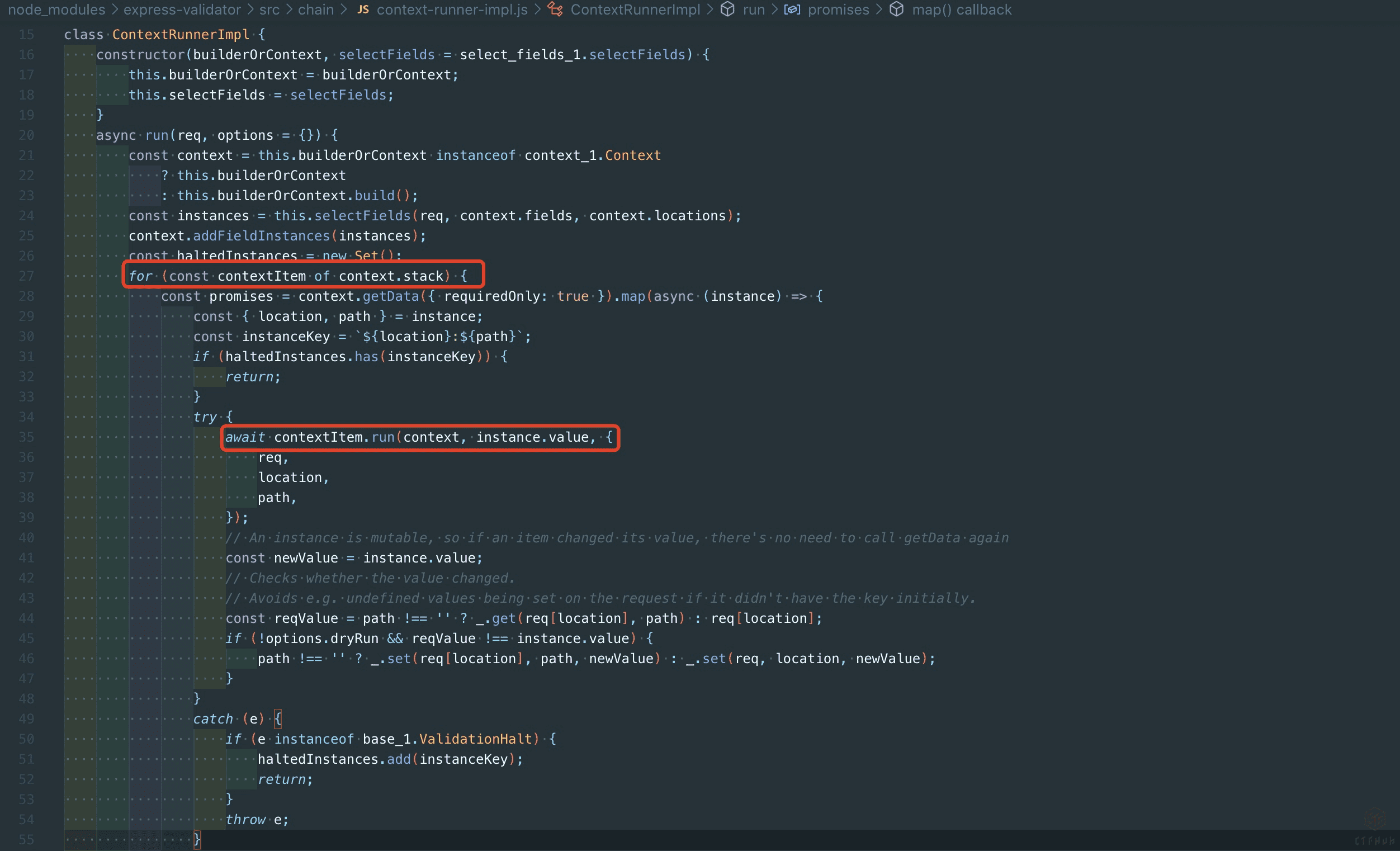 跟着上面过滤器(sanitizer)实现流程的最后几步,runner.run方法在context.stack里面循环遍历了contextItem,并调用了其run方法。