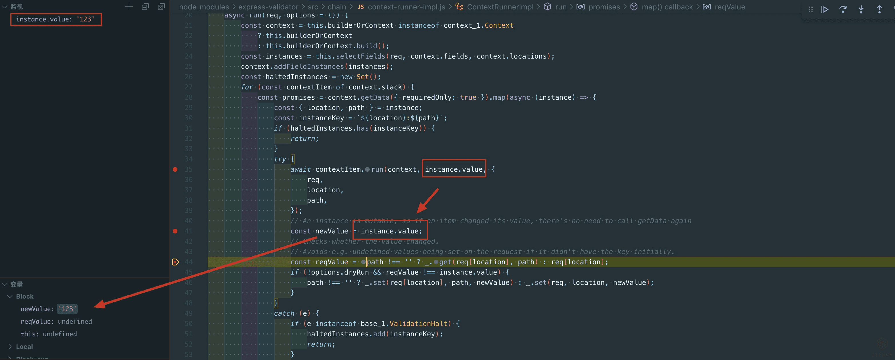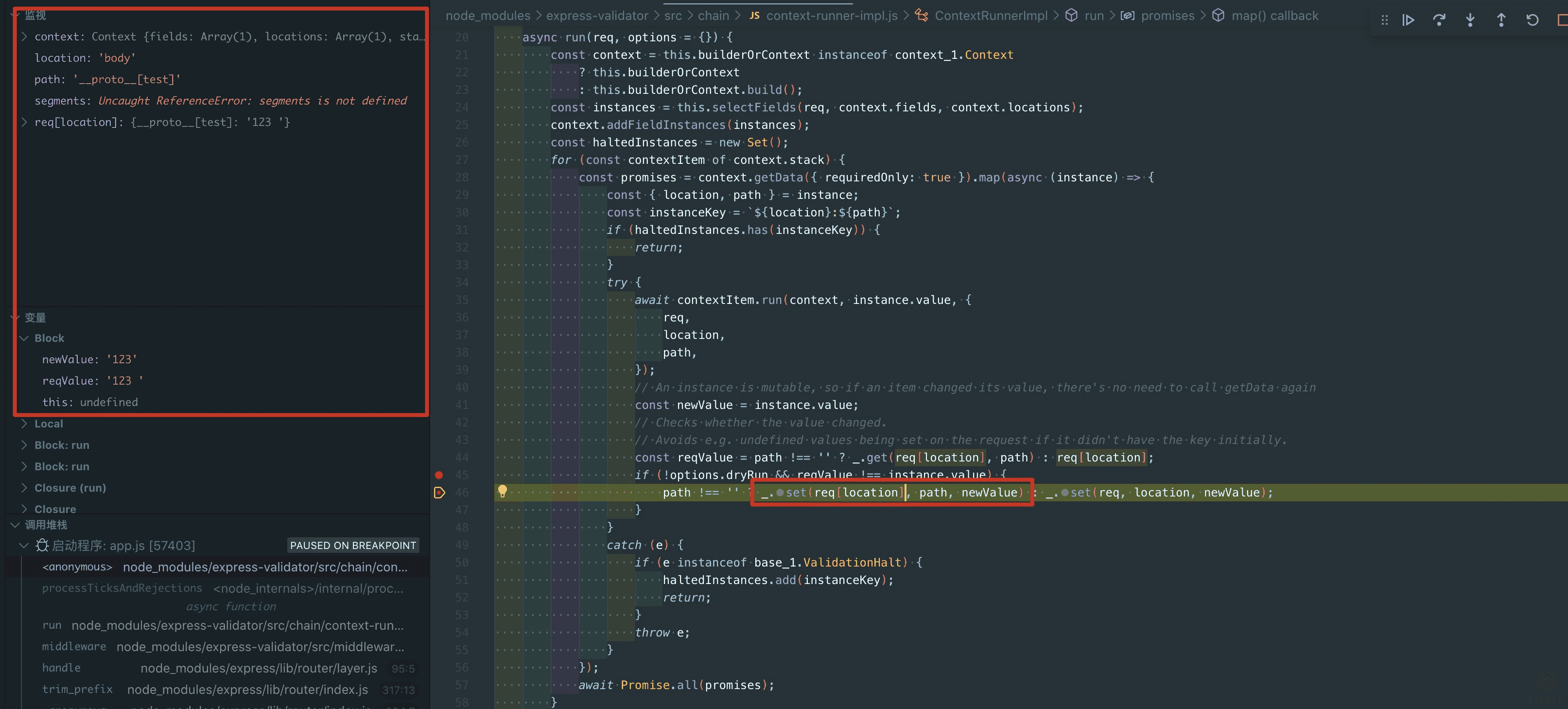 接着之前的过程,在经过了过滤器的处理之后,会通过lodash.set对指定的path设置新值,也就是如图中的_.set(req[location], path, newValue)过程。