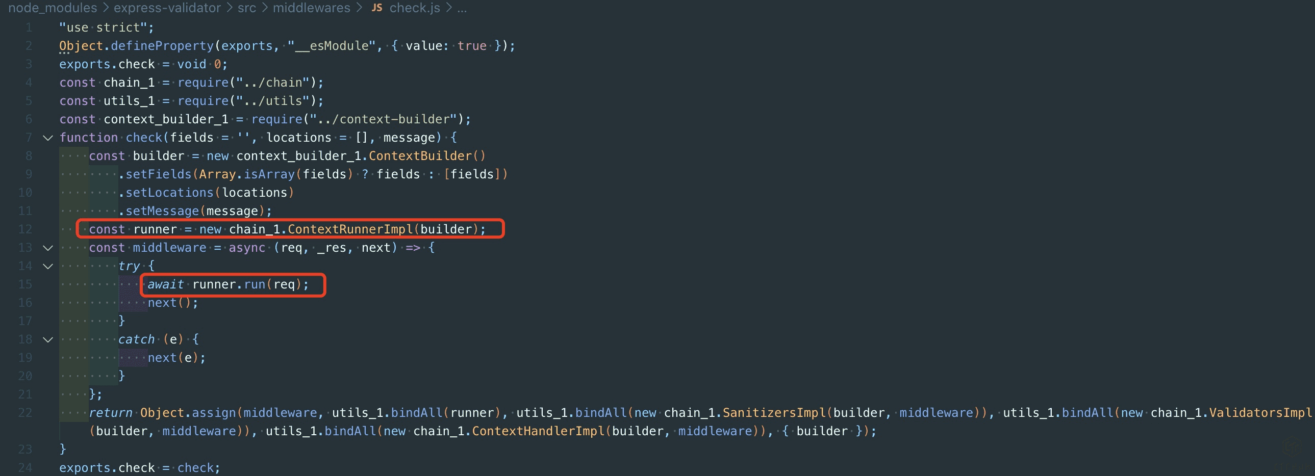 回到Sanitization类中的run方法,这个run方法是在哪调用的呢?再看到check.js,这里创建了一个runner对象,并在middleware里调用了run方法: