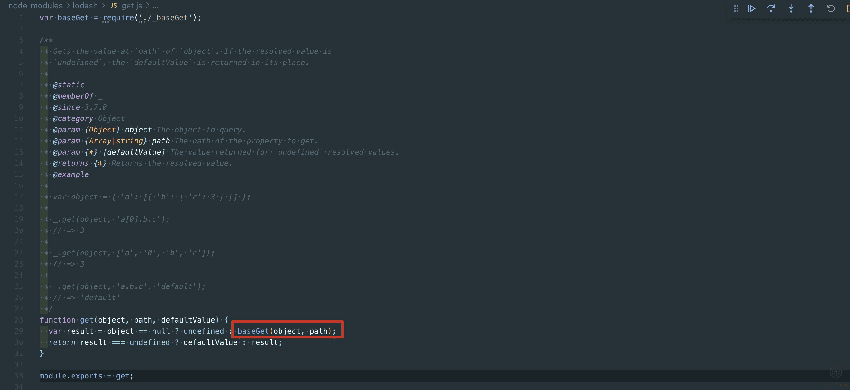 那我们还有没有办法污染呢?结果肯定是有的,我们跟入这个lodash.get方法,这个方法的具体实现位置位于:lodash/get.js
