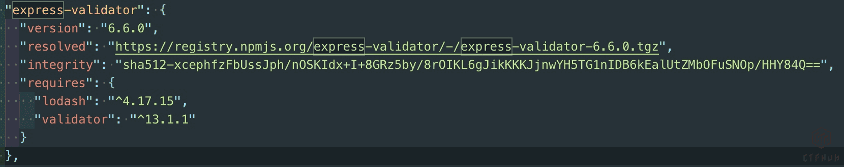 这是因为express-validator的依赖包中,lodash的安装版本最低为4.17.15的,所以在一定条件下会存在原型链污染漏洞。(这里的测试环境我们安装的是4.17.16版本,lodash在4.17.17以下存在原型链污染漏洞)