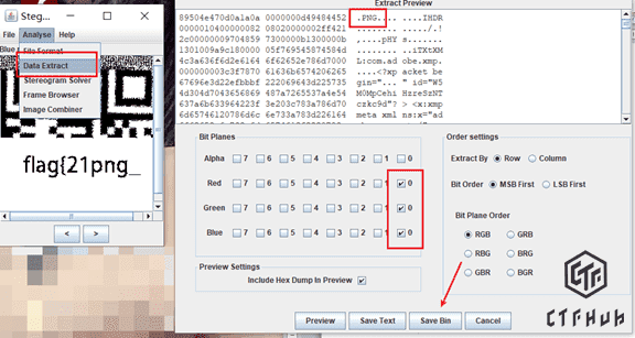 lsb技术(LSB全称leastsignificant bit,是一种基于图片最低有效位修改储存信息的隐写方法),在里面隐藏着一张png的图片。点击下方的save bin按键,保存为后缀为png的文件。就可把隐藏的png提取出来。