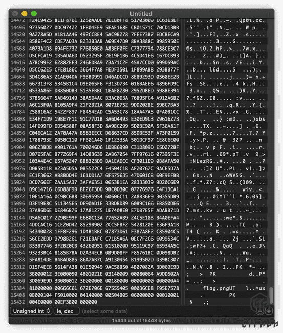 在winhex或hex fiend中还原为zip格式,保存为123.zip,成功还原出zip压缩包