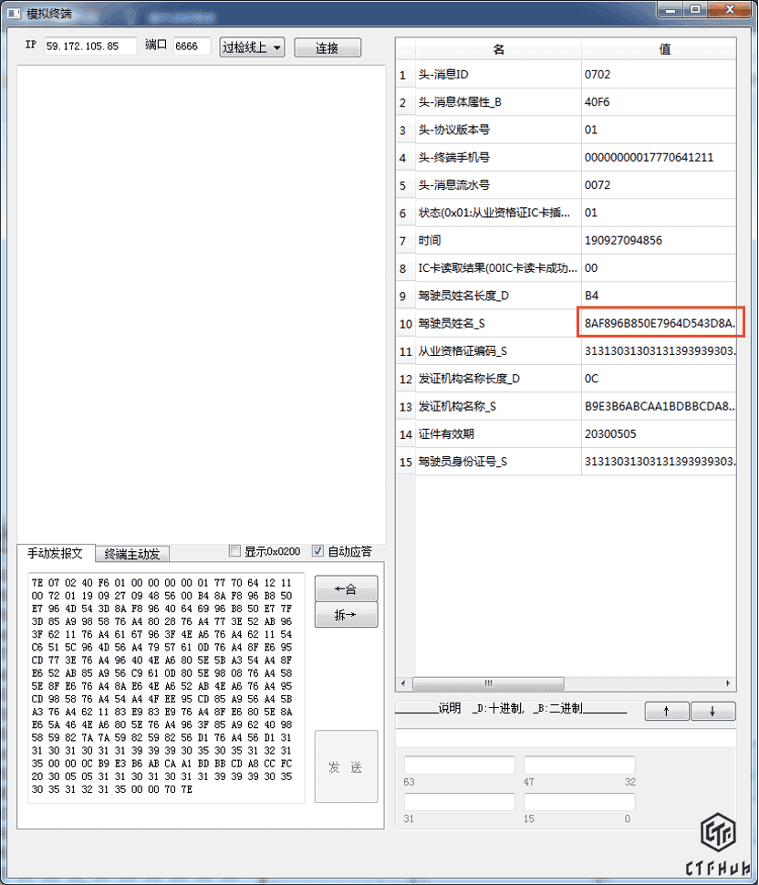 将报文用T808软件进行解析, 将驾驶员姓名复制出来,进行后续解析.