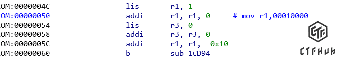 这样立即数SIMM只有16位,所以需要两次加载,使用lis(立即数载入并左移)和addi(立即数加法)两条指令完成。