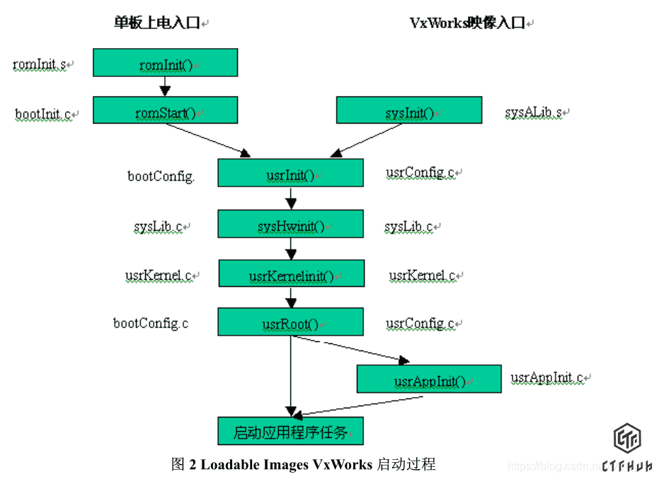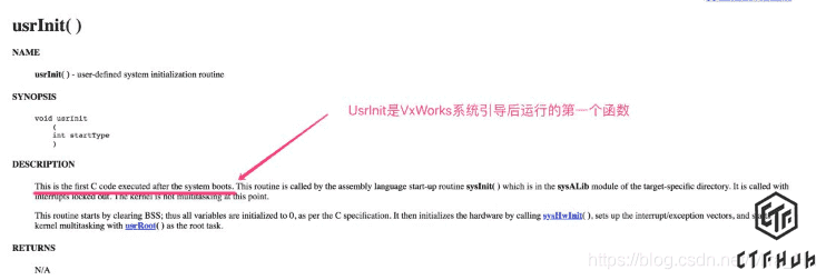 而usrInit函数则是VxWorks系统引导后运行的第一个函数,再结合之前我们分析的那段代码,可以基本确定在大部分情况下第一个跳转的地址就是usrInit这个函数的地址。