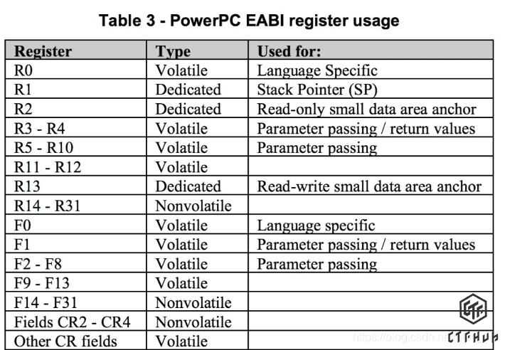 下图是PowerPC的寄存器用途说明,从图中可以看到R1寄存器是栈指针,而R3寄存器则是第一个参数。