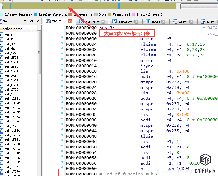 下图是默认加载后的IDA界面,仅仅分析出了极少数的函数。接下来就需要根据固件头部的这段代码来寻找加载地址的特征。