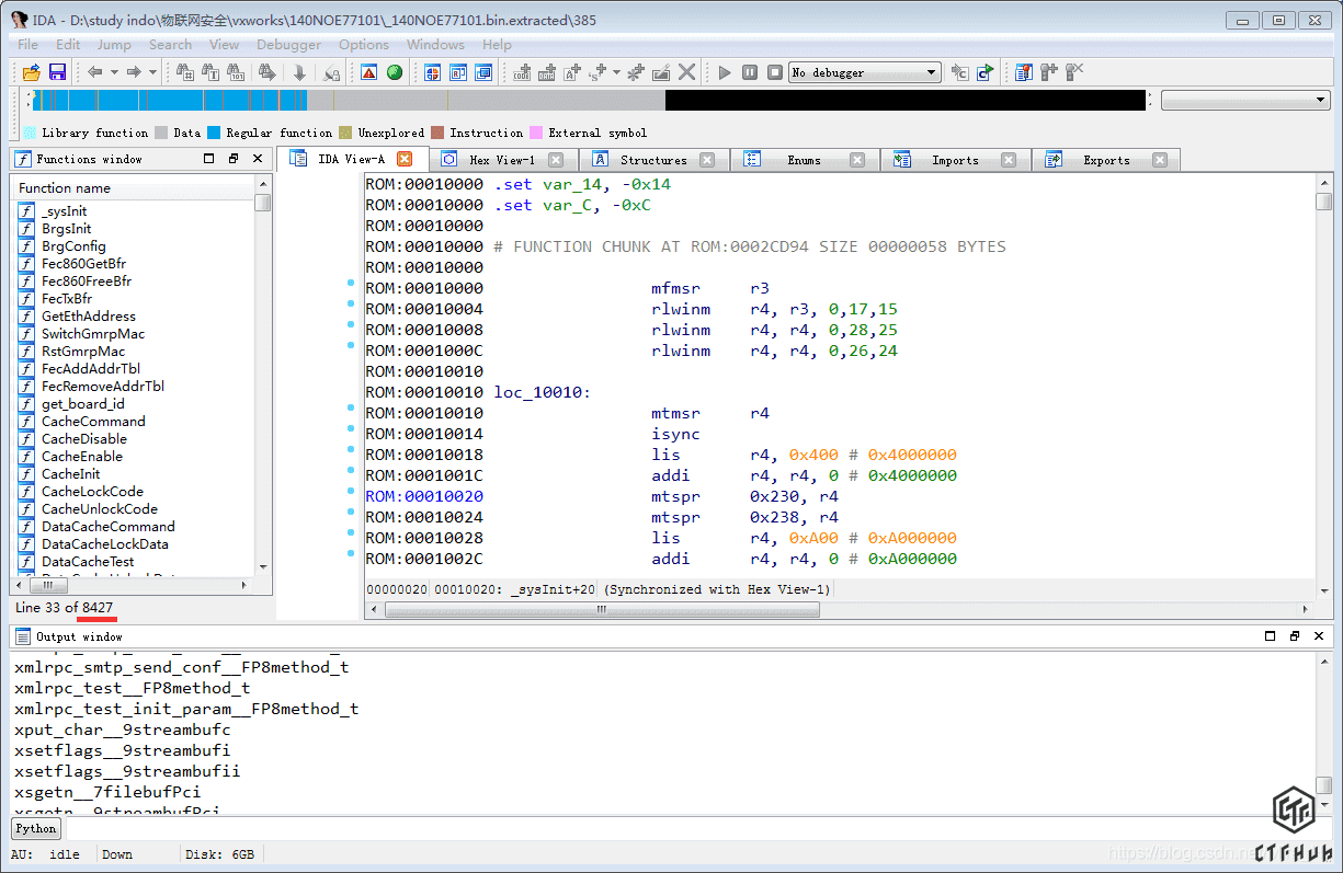 完成函数名修复后的IDA界面如下图所示,通过修复符号表IDA识别出了8000多个函数。至此VxWorks系统固件的预处理工作就全部完成了,现在我们就可以根据函数名来对一些关键服务的代码进行静态分析了。