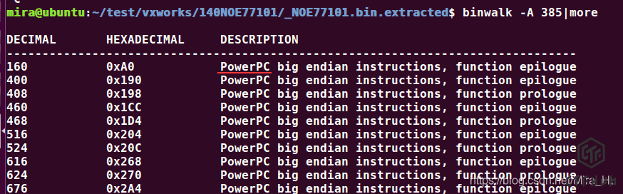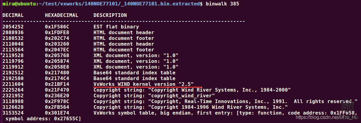 继续使用Binwalk对提取的385文件进行分析可以确认,该文件的确是我们所需要分析的VxWorks固件,因此提取的385文件也就是我们需要分析的固件文件了。