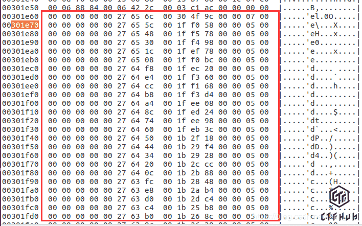如下图所示,VxWorks 5系列的符号表有他独特的格式,他以16个字节为一组数据,前4个字节是0x00,之后是符号名字符串所在的内存地址,后4个字节是符号所在的内存地址,最后4个字节是符号的类型,例如0x500为函数名。