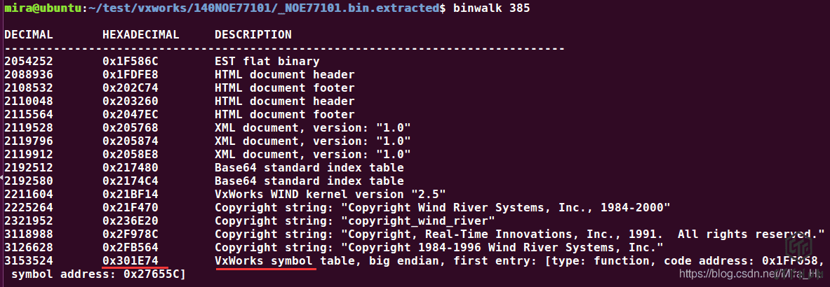 通过使用binwalk可以帮助我们辅助分析VxWorks固件中是否编入了符号表,并识别出符号表在固件中的位置。如下图所示binwalk识别出的符号表地址在文件偏移0x301E74处。