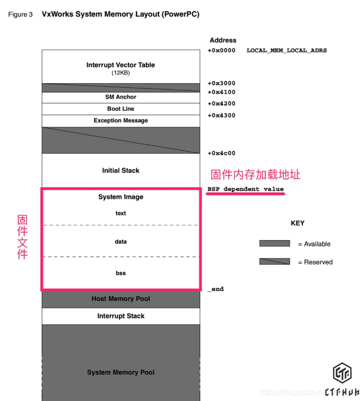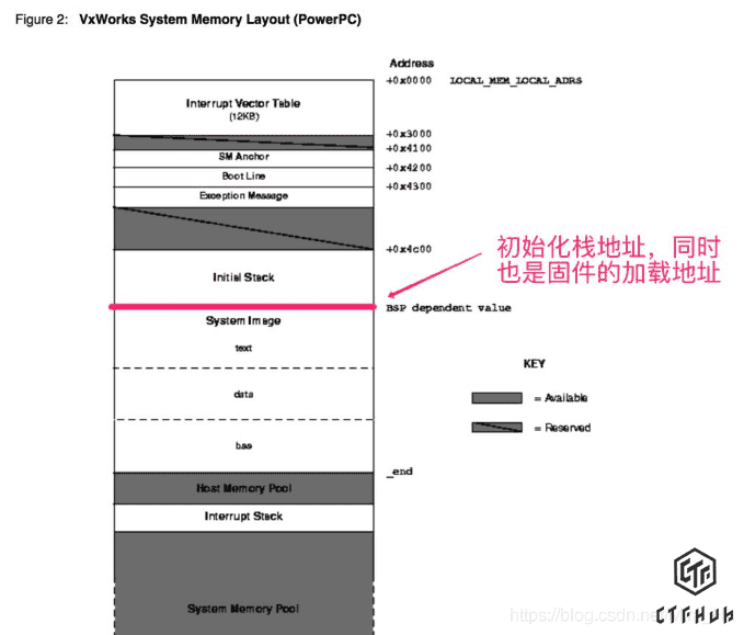随后我们再回忆一下之前看到的VxWorks PowerPC内存布局图可以发现,初始化栈的地址同时也是固件的内存加载地址,因此r1寄存器指向的0x10000就是我们所寻找的固件加载地址。