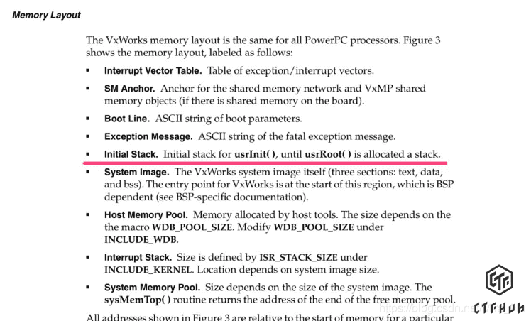 根据VxWorks官网文档对对内存布局的描述,Initial Stack是usrInit函数的初始化栈。