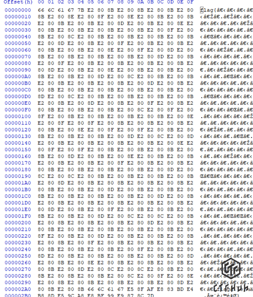打开16进制发现不可显字符串,看到很多0宽度字符,符合0宽度隐写的特征