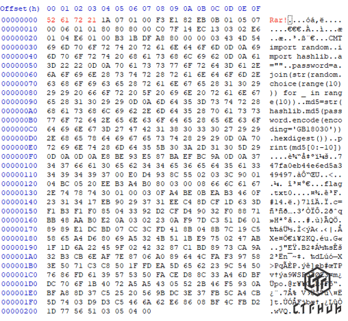查看十六进制 符合压缩包的特征,文件头的四字节符合zip特征,但往后符合RAR文件特征