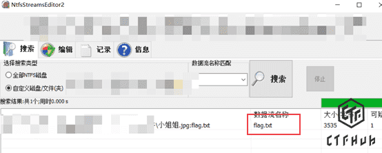 在解题过程中合理使用工具,因为题目中提到被植入木马病毒,并且所给出的都是些图片以及文本信息。那么合理使用一些ntfs流木马查杀的工具,如scanntfs,NtfsStreamsEditor2等,可以发现正常文件中异常的ntfs流。
