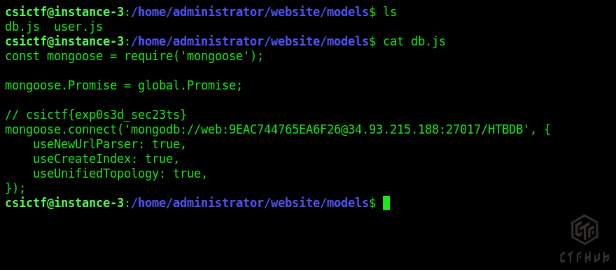 After greping for "csictf" from ~/ , I found the flag csictf{exp0s3d_sec23ts} in /home/administrator/website/models/db.js.